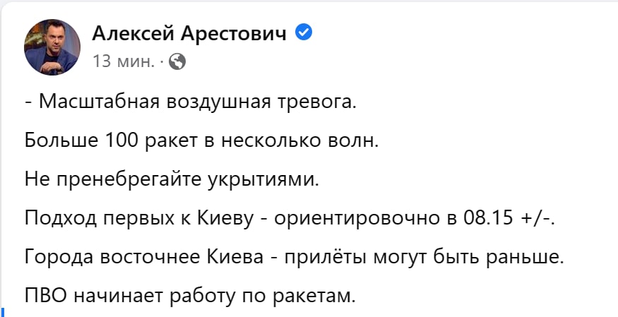Радник Офісу президента Олексій Арестович повідомив, що по Україні сьогодні планують вдарити понад 100 ракет у декілька етапів.Фіксують роботу ППО над Києвом, Житомирщиною, Одесою, Сумщиною.
