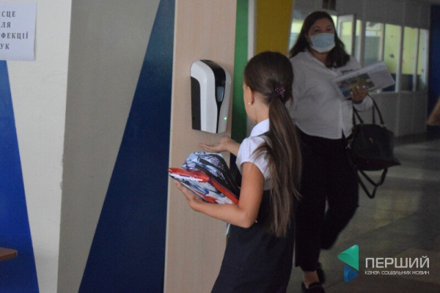 На всіх 4 входах у школу стоять сенсорні санітайзери – підносиш руку і на неї розбризкується антисептик. Запасів, кажуть в гімназії, вистачить на кілька місяців.