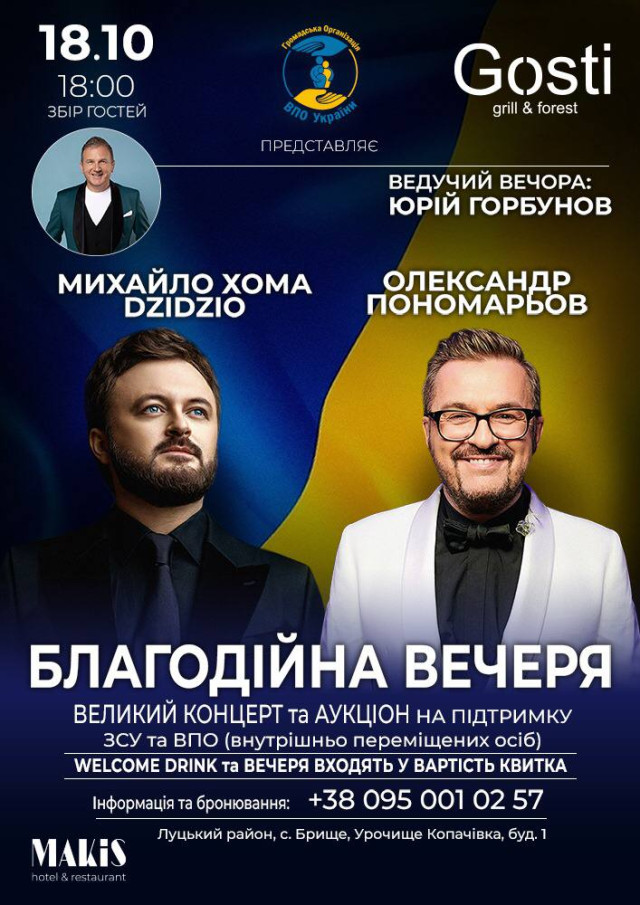 18 жовтня о 18:00 у ресторані Gosti, що розташований в селі Брище Луцького району, відбудуться благодійна вечеря, великий концерт та аукціон на підтримку наших захисників від Михайла Хоми (DZIDZIO) та Олександра Пономарьова. Ведучий вечора – Юрій Горбунов.