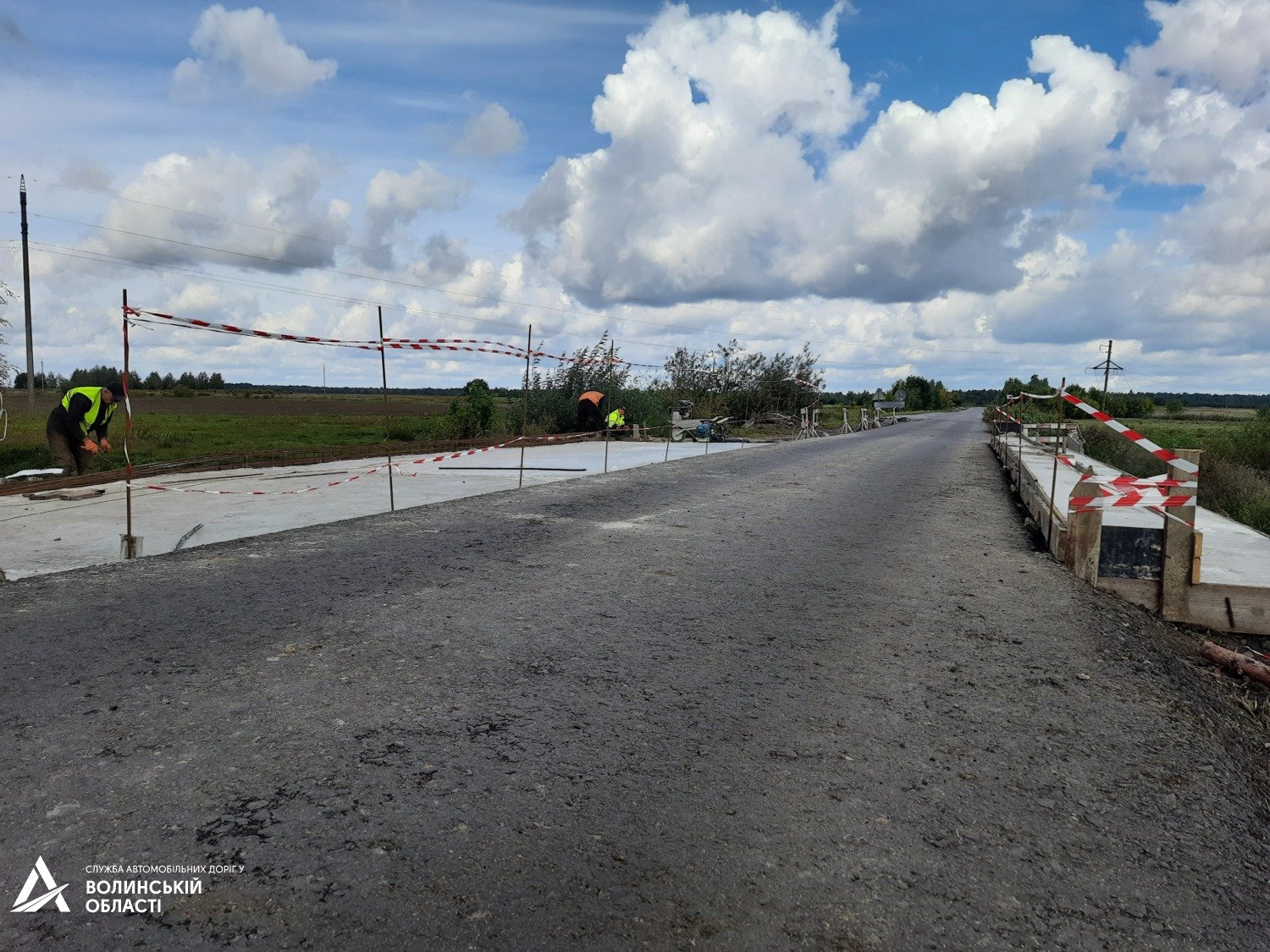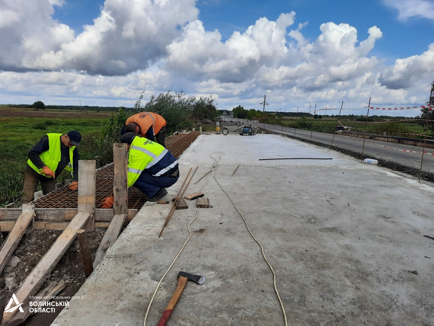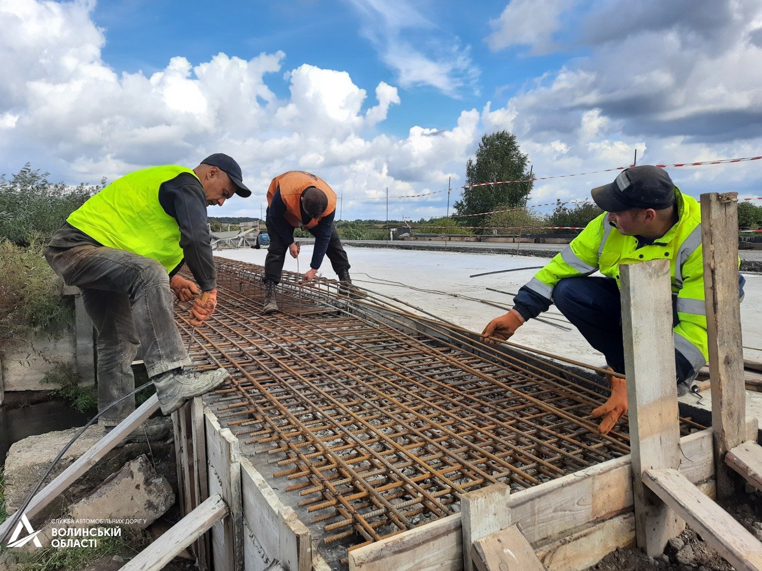На Волині дорожники продовжують ремонтувати міст біля села Сокіл, роботи над яким були призупинені через війну.
