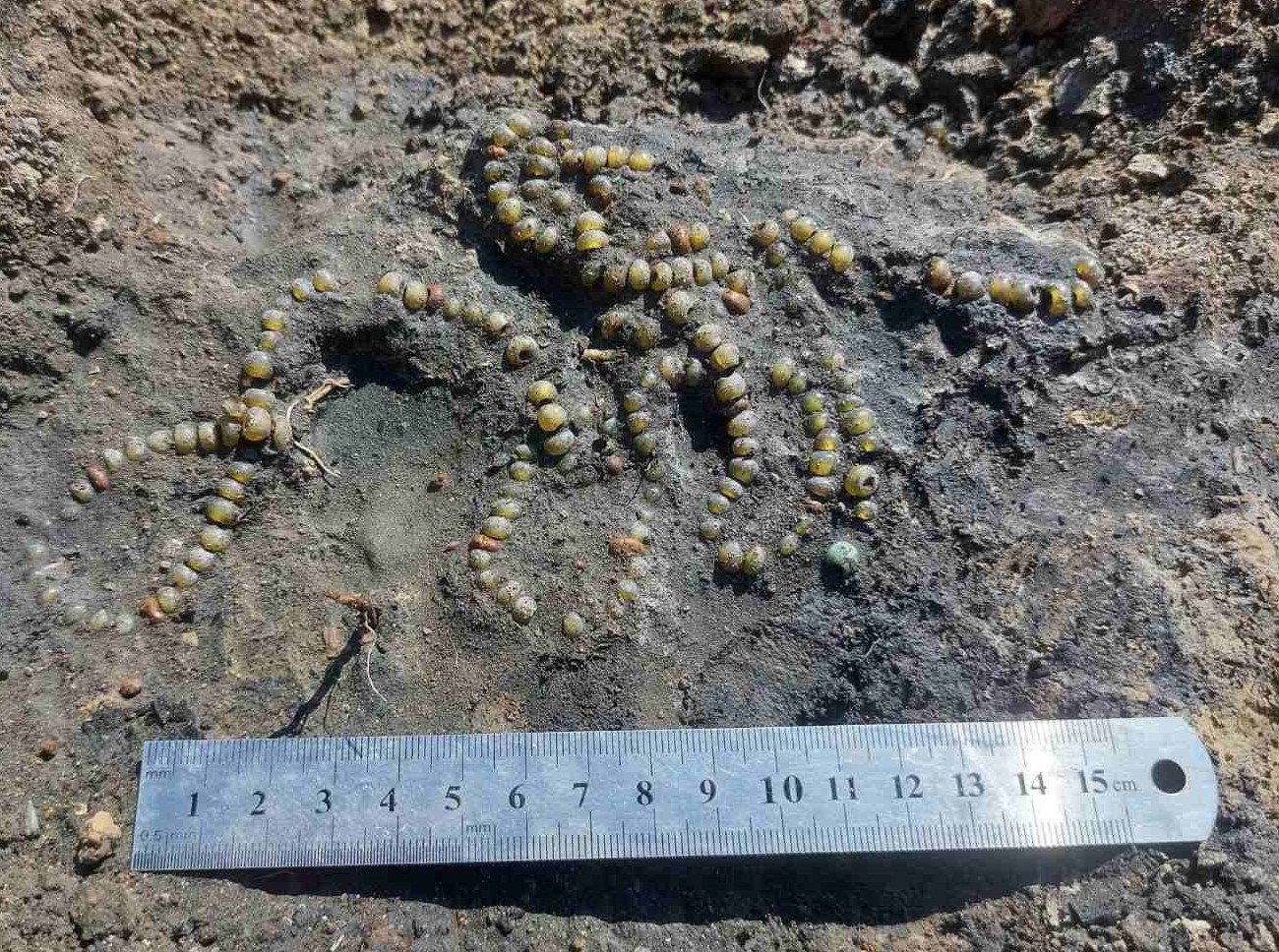 На робочому фото момент фіксації знахідки, на фото – комплект намиста під час наукового опрацювання», – розповів археолог.