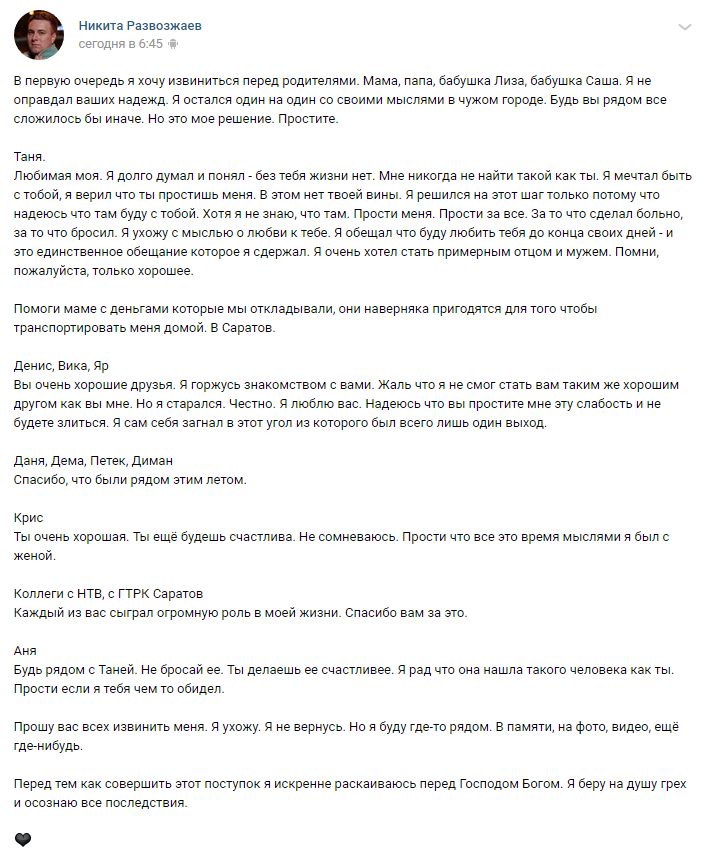 "Я хочу попросити вибачення перед батьками. Мамо, тату, бабусю Лізо, бабусю Сашо. Я не виправдав ваших сподівань. Я залишився наодинці зі своїми думками в чужому місті. Були б ви поруч, все склалося б інакше. Але це моє рішення. Вибачте", - написав кореспондент.Інформацію про смерть журналіста підтвердив його колишній начальник на ДТРК “Саратов”. Телеканал НТВ поки ніяк не прокоментував те, що трапилося. Нагадаємо, у 2017 році в Парку Горького в Москві, де 2 серпня традиційно відзначається День ВДВ, невідомий чоловік вдарив кореспондента НТВ Микиту Развозжаєва. Це сталося у прямому ефірі.