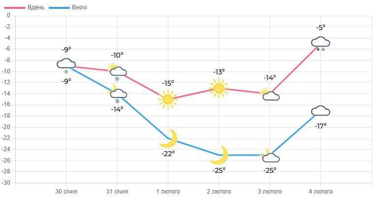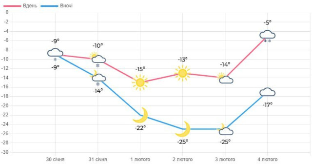 2 лютого прогнозують мінливу хмарність. Без опадів. Ожеледиця. Вітер північний, 5-10 м/с. Температура вночі – 23-28° морозу, вдень – 13-18° морозу.