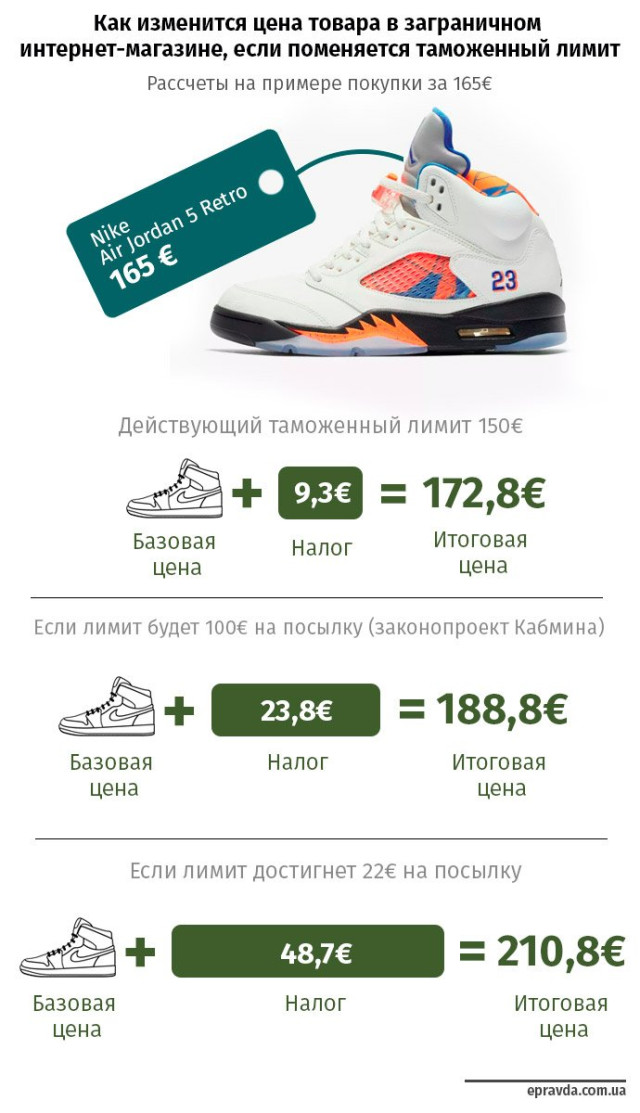 Норми закону передбачають, що при ввезенні на територію України товарів вартістю понад 100 євро для одного одержувача на них нараховується ПДВ в 20% і 10% мита з суми, що перевищує ліміт.