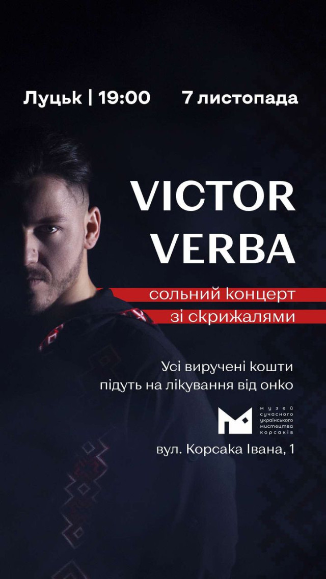У межах туру «Подолати хворобу» 7 листопада в Луцьку у Музеї Корсаків відбудеться сольний концерт Віктора Верби. Співак виконуватиме під гітару та фортепіано пісні гурту MOTANKA й нові композиції.