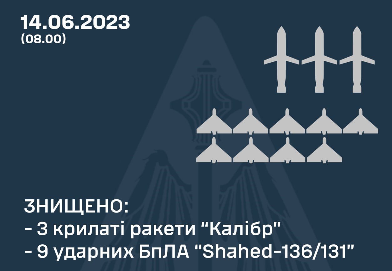 Тож загалом силами та засобами Повітряних сил, у взаємодії з ППО складових Сил оборони України, під час цієї нічної атаки знищено 12 повітряних цілей: три крилаті ракети «Калібр» та дев’ять іранських ударних дронів «Shahed-136/131».