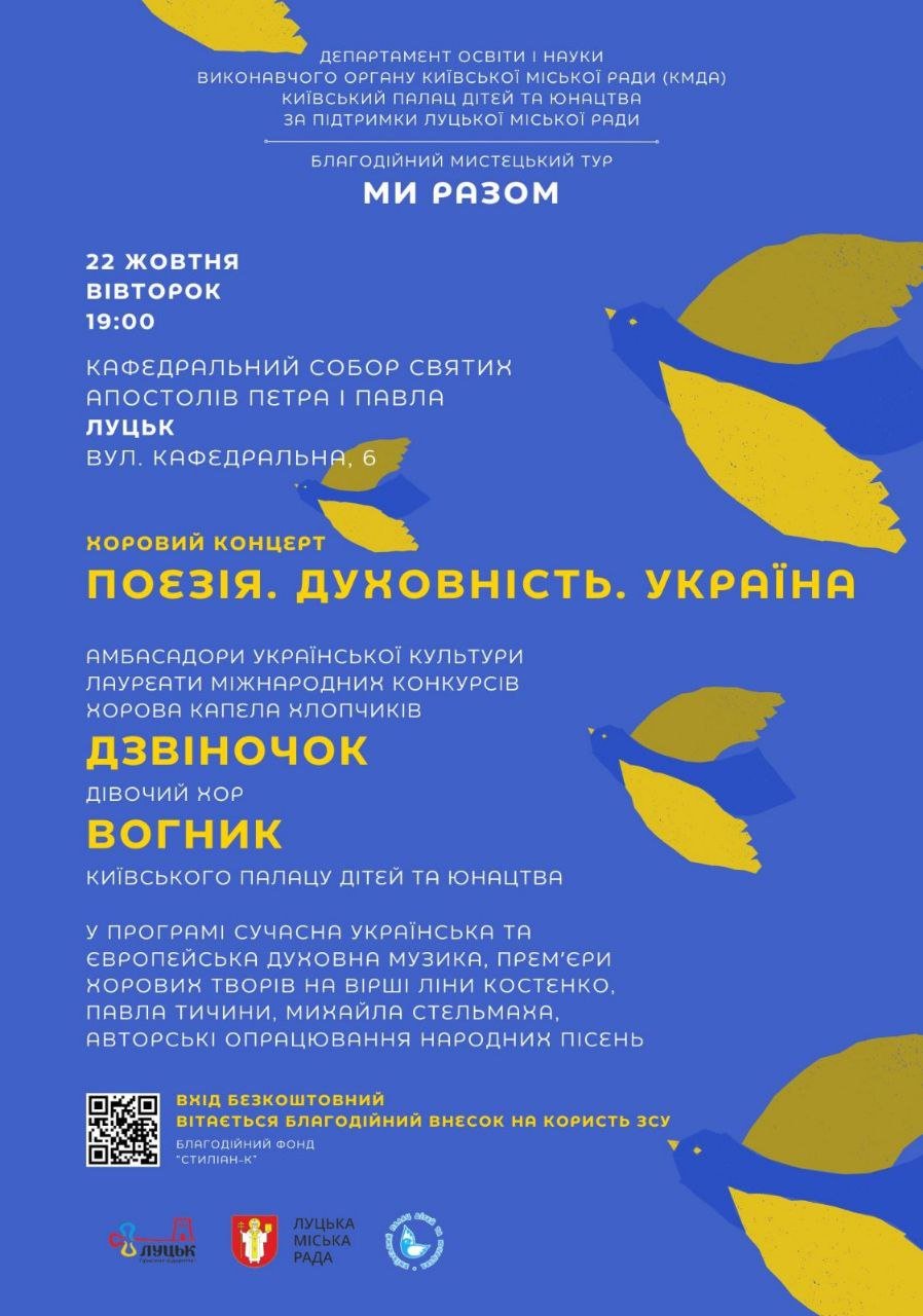 Прямуючи з Києва до Нідерландів, у межах благодійного туру «МИ РАЗОМ» 22 жовтня до Луцька завітають Хорова капела хлопчиків «Дзвіночок» та дівочий хор «Вогник».