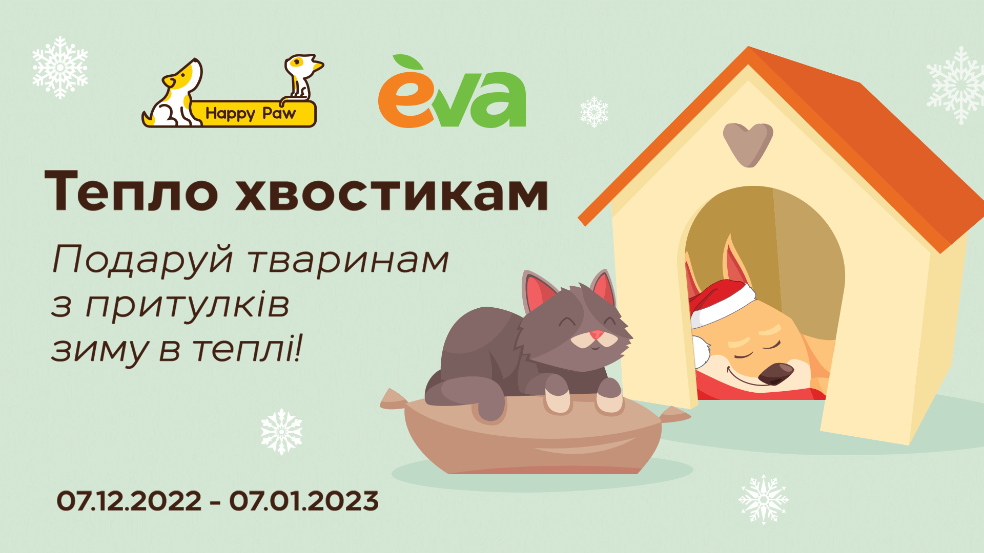 Мета ініціативи «Тепло хвостикам» – зібрати 400 000 гривень на новенькі будки і дрова для приготування їжі та обігріву притулків. Кожен, кому небайдужа доля песиків та котиків, що поки не мають своєї людини, може допомогти закрити збір. Зробити переказ від 1 гривні на підтримку хвостиків з притулків можна також на касі будь-якого магазину EVA.