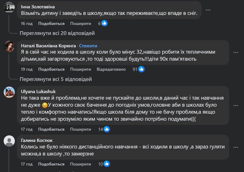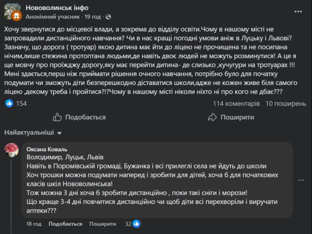 У Facebook-спільноті Нововолинська деякі місцеві жителі підтримують, а деякі виступають проти рішення міськради. Зокрема, користувачі соцмереж обговорювали доцільність скасування очного навчання через низькі температури.Прихильники традиційної форми навчання навпаки відповідали, що погодні умови не є приводом не йти до школи.Як зазначив Олег Янюк, наразі офіційних звернень від батьків із проханням запровадити дистанційне навчання в громаді до нього не надходили.