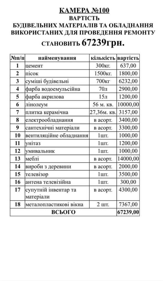 «Знаю, що вам просто не терпиться дізнатися, а що ж там у нас з ремонтами безкоштовних камер за рахунок надходжень від платних камер... На цей раз камера на 22 особи у Державній установі «Київський слідчий ізолятор», вартість ремонту – 67 239 гривень», – зазначив він у коментарі до фотографій.