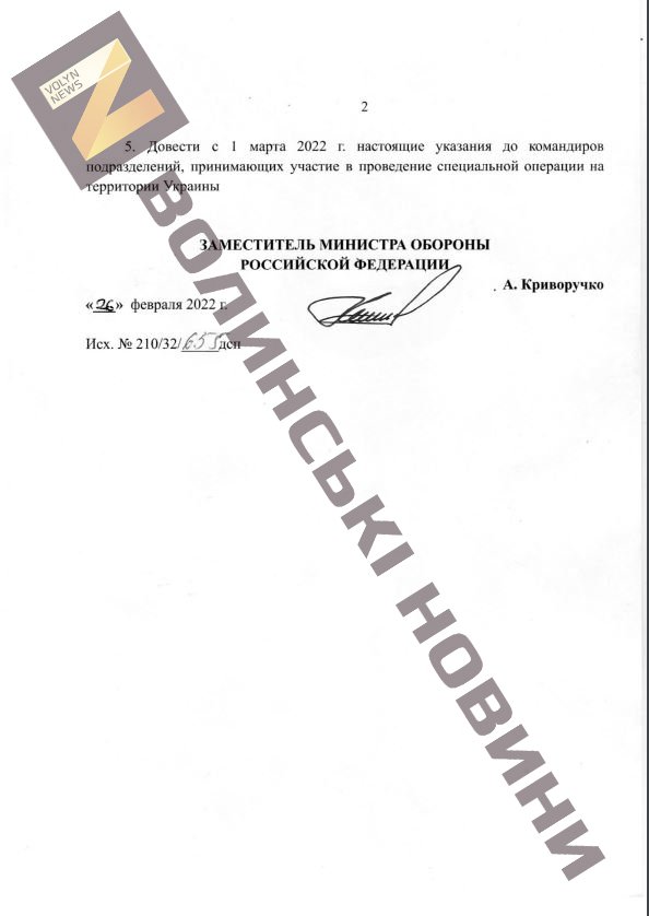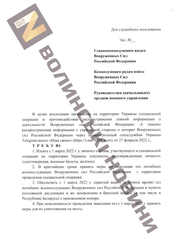 Інформаційному агентству Волинські Новини надійні джерела надіслали копію наказу для службового користування, який отримали командири підрозділів, задіяних у війні з Україною, названою в Росії «спецоперацією».