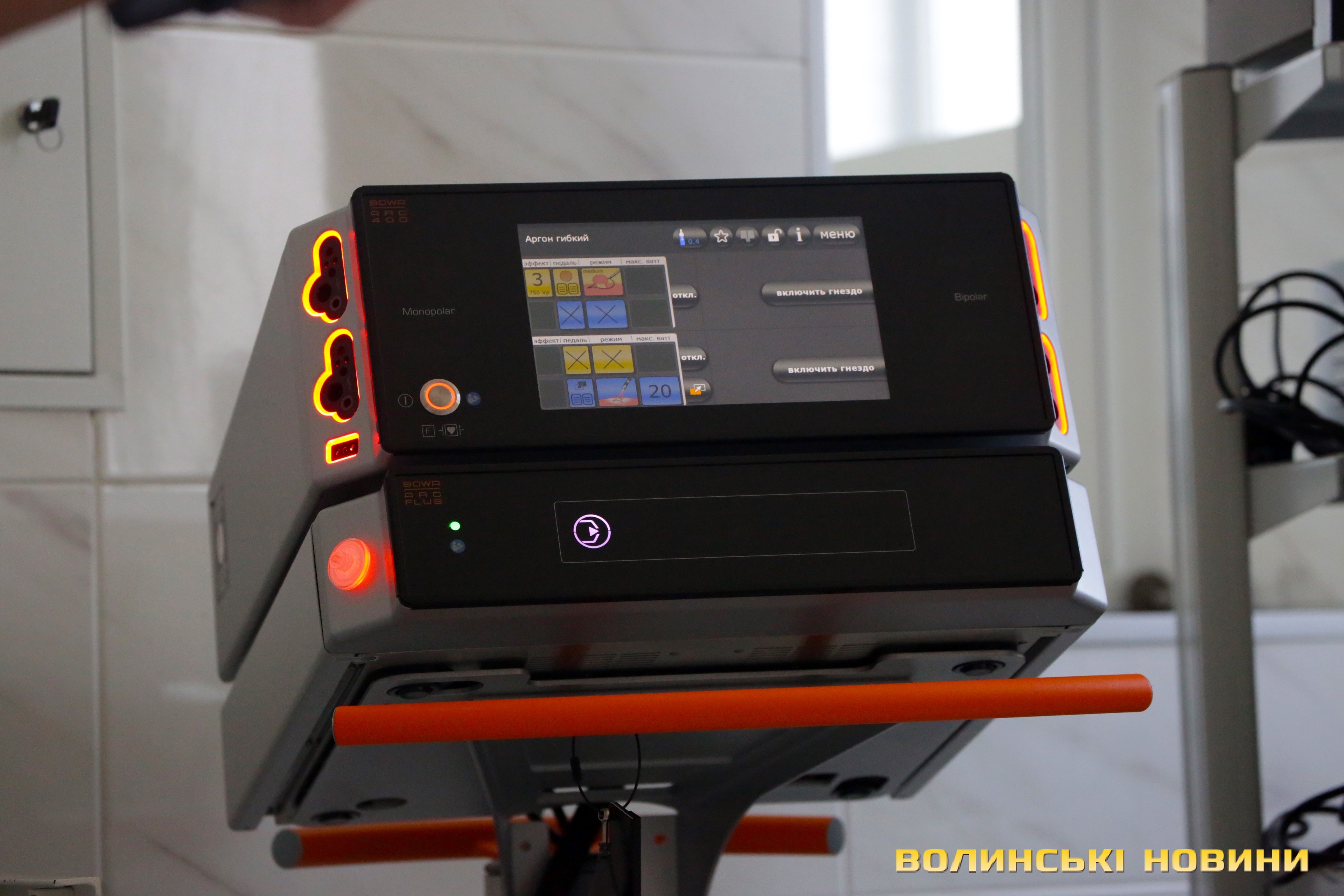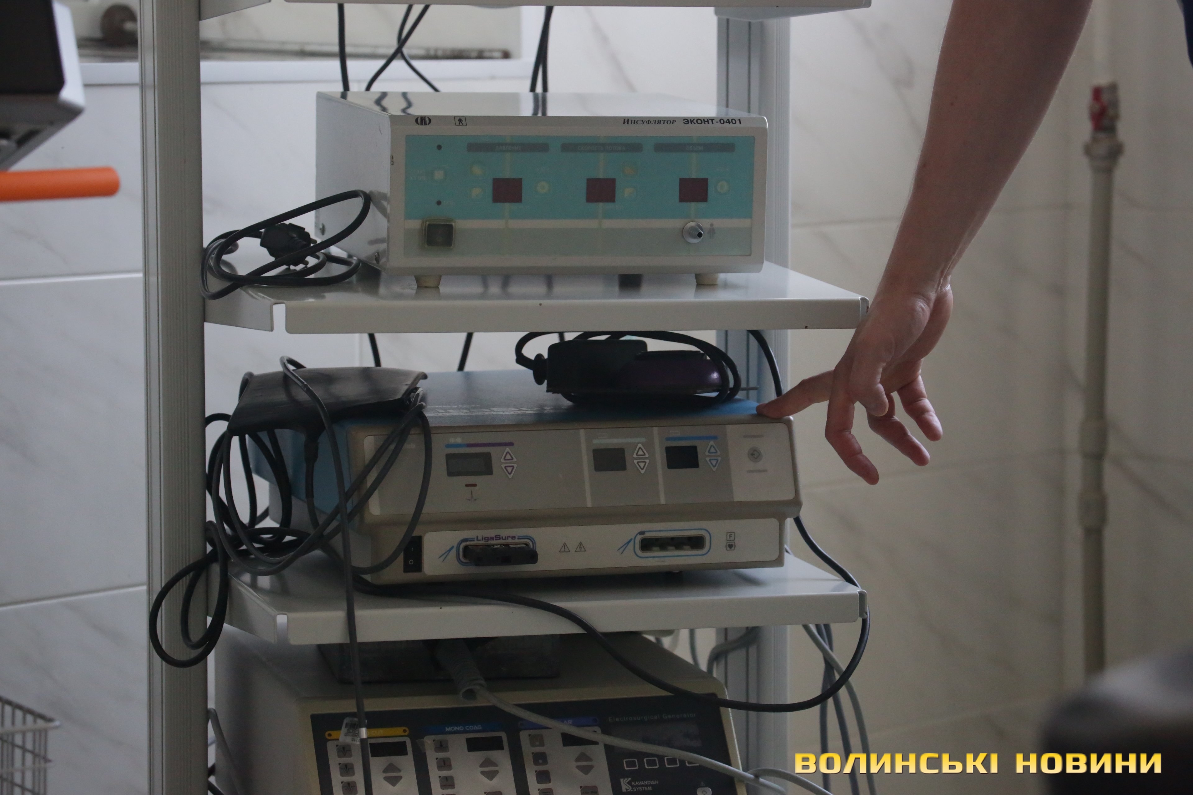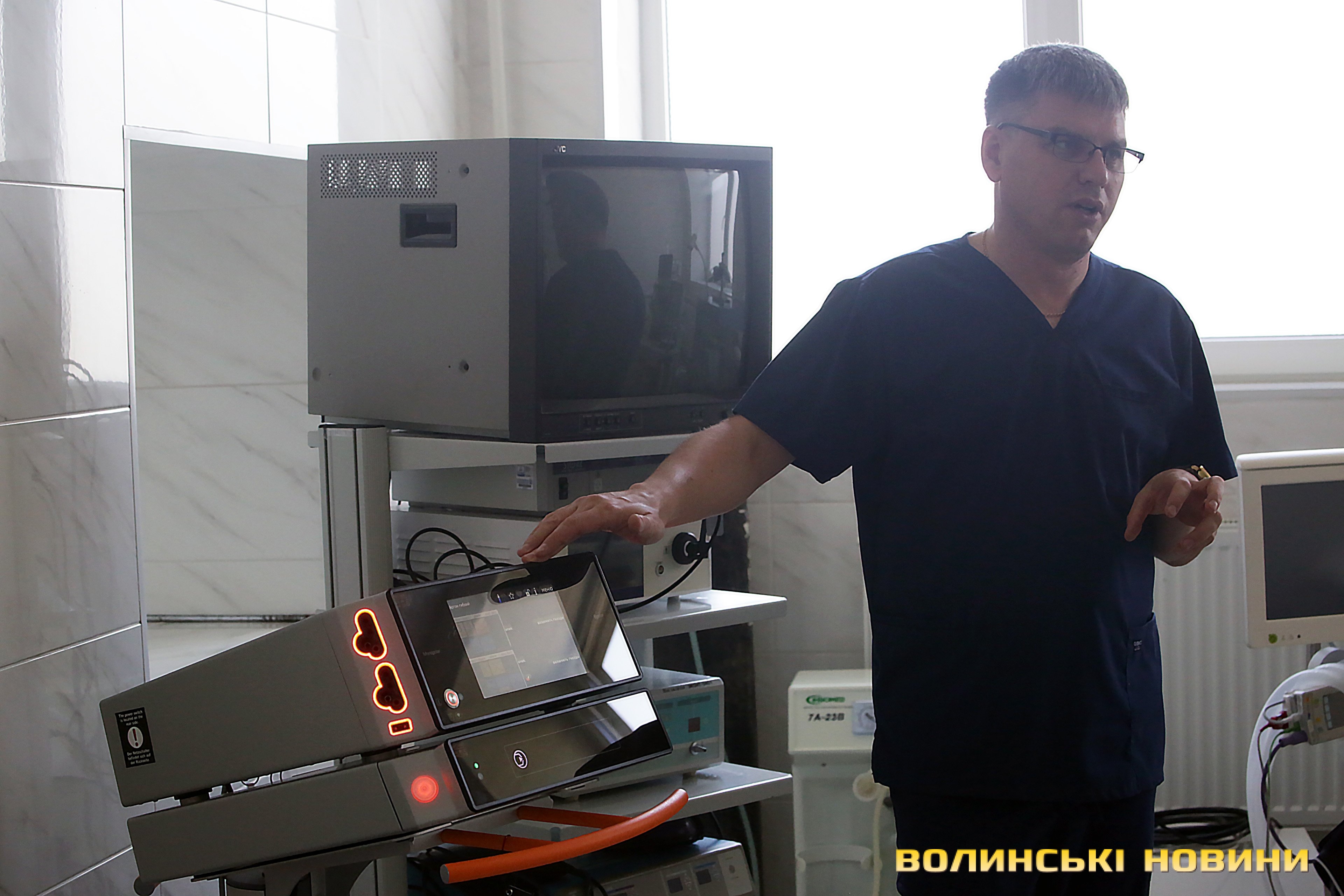 «Усі структурні підрозділи повністю забезпечені найновішим обладнанням провідних світових брендів, діагностичні відділення – сучасними УЗД апаратами, фіброскопами, бронхоскопами та іншим. Зокрема маємо найсучаснішу систему аргоноплазменної коагуляції, яка дає можливість зупинити кровотечу без розрізу в будь-якому органі. Чому це важливо? Тому що у наших планах – створення регіонального Центру зупинки кровотеч на базі лікарні», – не без гордості продовжує ознайомлювати із новітнім обладнанням головний лікар.Демонструє апарат розумної коагуляції, який для потреб лікарні подарували колеги із Франції. Його вартість – 200 тисяч євро. Обладнання дає можливість зупиняти кровотечу під час операції.