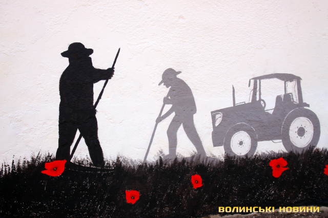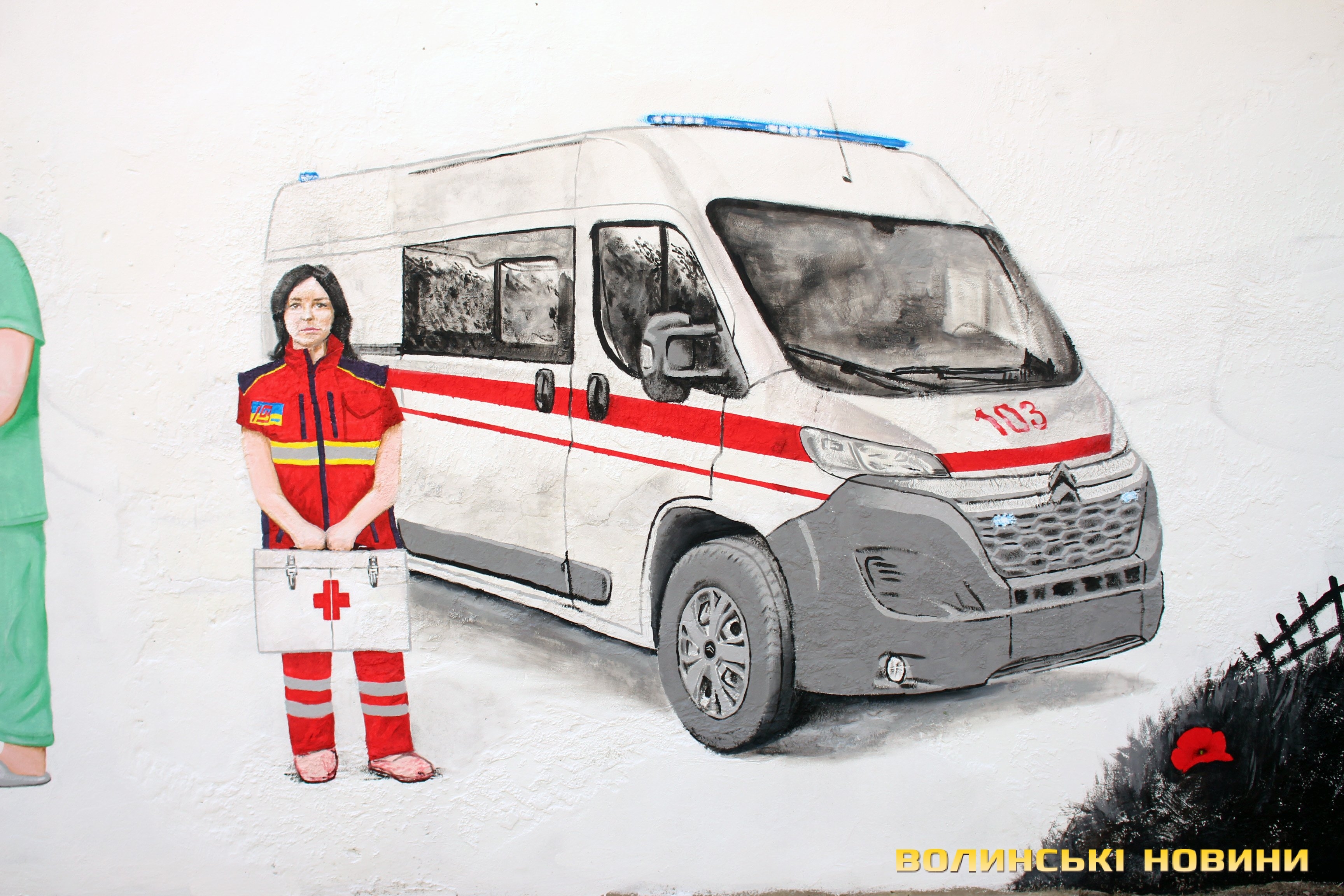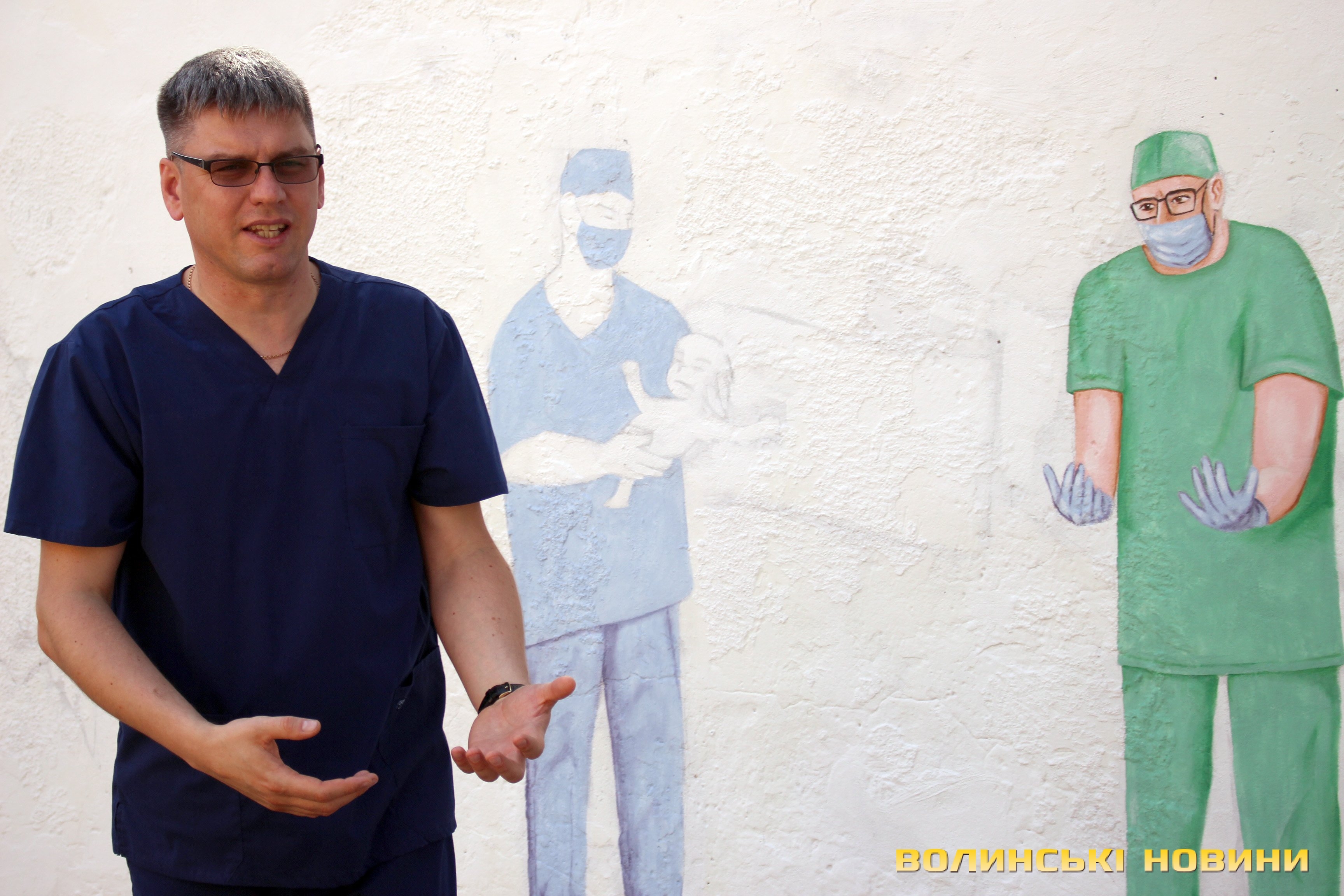 «Цей мурал – це шедевр рук талановитих стрітартерів – харків'янина Максима Плотнікова та мешканця Нововолинська Павла Москаля. Ескіз розробила художниця та викладачка Нововолинського центру профтехосвіти Світлана Войтович. Цей мурал присвячений тим, хто наближає перемогу: лікарям, військовим, фермерам тощо. А ось це по завершенню роботи маю бути я», – усміхається лікар, показуючи на фрагмент, де чоловік у медичному костюмі простягає руки, аби взяти новонароджене немовля.
