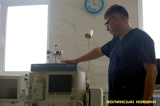 «А цей апарат преміум-класу нам подарували поляки. Цей давач одягють під час операції на палець пацієнту і за імпульсами у його м’язах визначаємо глибину дії наркозу. Якщо наркоз неглибокий, тобто кажучи простою мовою, пацієнт ще не встиг прокинутися, але м’язи вже рухаються. Також на лоб прикріплюють давач, який теж визначає глибину наркозу, фіксуючи електроімпульси головного мозку. Тобто пацієнту боляче, тіло на цей біль ще не реагує, а от мозок починає реагувати. Це незамінний прилад під час проведення операцій новонародженим і пацієнтам з тяжкою серцево-судинною патологією. Наявність такого апарата унеможливлює передозування наркозом», – наголошує медик.До слова, станом на 26 серпня у лікарні є сім робочих операційних.