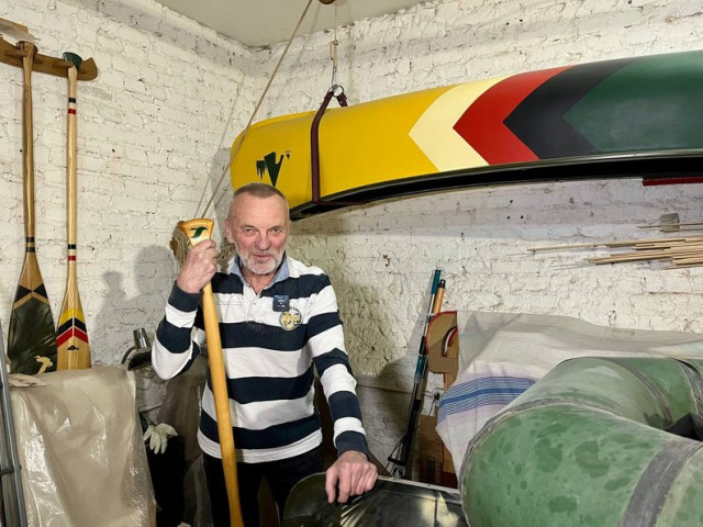 «Воно називається рейкове каное, бо воно виготовлено було з таких рейочок. Це дерево осика. Потім воно покривається склотканиною, на епоксидці, на посиленій смолі, потім фарбується, потім зверху яхтовим лаком. Я зробив це для молодшої внучки. От вам різниця – це каное, що я робив з фанери, коротше, бо це 4,20 має довжину. Це 37 кг важить, а це важить 27 кг», – каже майстер.Глечики, миски й декоративні фігури: над чим працює майстер у Луцьку