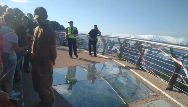 Слідчі та криміналісти обстежують пошкоджені фрагменти скляної підлоги нового моста у Києві, рух на цій ділянці мосту наразі обмежено.