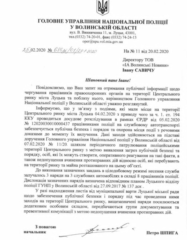 Гадаю новий начальник ГУНП України у Волинській області такого срачу, що зараз існує на ринку терпіти не буде, а займеться боротьбою зі злочинністю. Безоплатну охорону Шпига надав старому ринку. Брєд. Нехай краще займається злочинністю в нашому краї, тим більше що він сам з Любомльського району. До слова: на Волині наявний ріст числа вчинених злочинів (з 9296 до 10 432). Зріс і рівень злочинності на 10 тисяч населення (з 89,6 до 101). Збільшилася кількість кримінальних дорожньо-транспортних пригод (з 279 до 329, або на 17,9 %), з них зі смертельними наслідками – з 58 до 74, або на 27,6%. Зросло число злочинів, вчинених неповнолітніми (з 110 до 151, або на 37,3 %), та підлітків, що вступили у конфлікт із законом (з 66 до 108, або на 63,6 %).