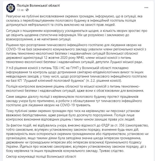 Очільниця обласного осередку партії Порошенка заявила, що в пологовому будинку працює поліція, буцімто для «тиску» на колектив. В поліції зазначили, що лише контролюють виконання рішень комісії ТЕБ і НС та Луцької міської ради.