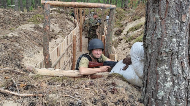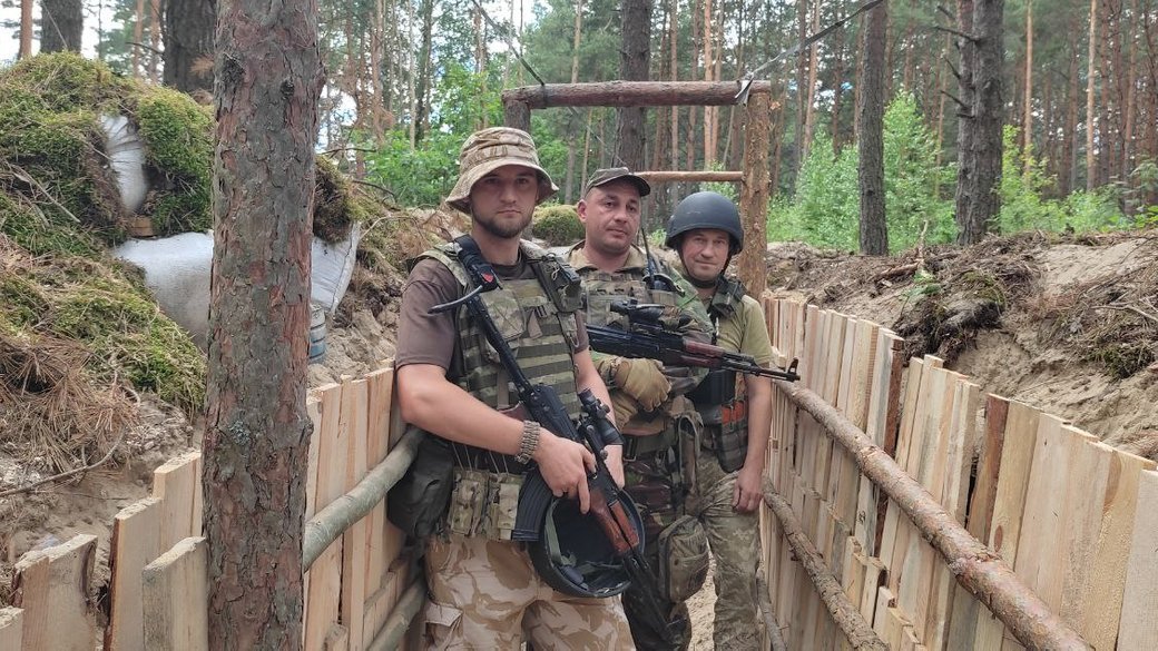 Військовослужбовці бригади територіальної оборони продовжують укріплюватися на позиціях, пояснює військовий Андрій. Показує укриття, розпізнати яке з неба над лісом неможливо.