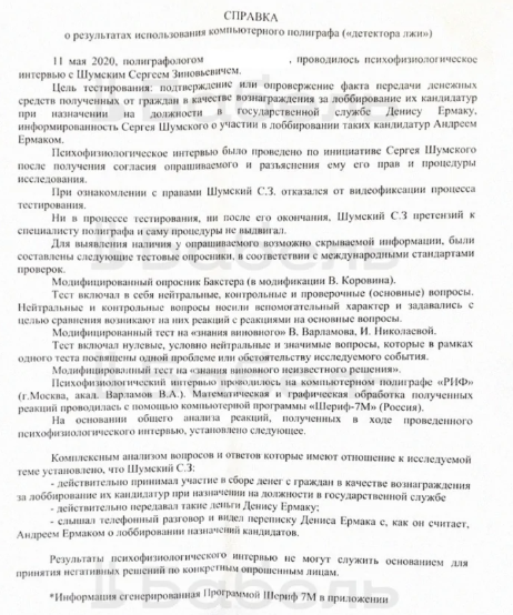 Про це йдеться в довідці про результати проходження поліграфа Штанько і Шумським. Документ є в розпорядженні «Бабеля».Дослідження 11 травня проводив поліграфолог, який попросив не називати його імʼя публічно через побоювання за свою безпеку. У «Бабеля» є його дані, а також копії свідоцтва про успішне проходження курсів експерта-поліграфолога і посвідчення поліграфолога. Ця інформація дозволила знайти його в реєстрі, який веде Всеукраїнська асоціація поліграфологів.