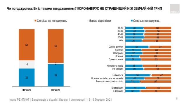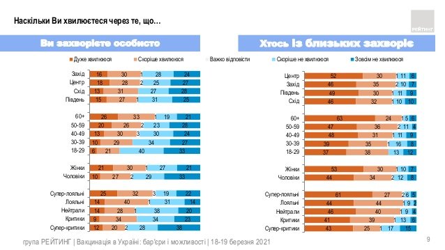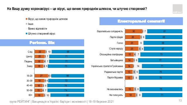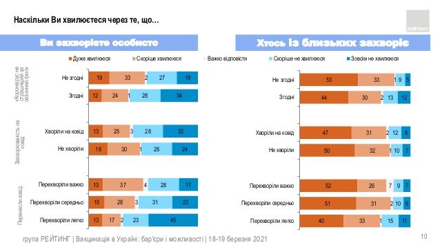 Серед тих, хто вважає вірус штучно створеним, відносна більшість переконана, що його створили в результаті наукового експерименту (31%) як бактеріологічну зброю (27%) з метою зменшення кількості населення (40%). Ще 17% – з метою створення економічної кризи, 16% – з метою заробітку на вакцині, 12% – задля контролю над людьми.Опитування також показало, що в українців рівень страху захворіти особисто на COVID-19 вдвічі нижчий за страх, що захворіють близькі. 80% зазначили, що хвилюються через те, що можуть захворіти їхні близькі та знайомі, 19% – не мають таких побоювань. Натомість щодо себе особисто, то хвилюються через те, що можуть захворіти 45%, не хвилюються – 54%.За рік також зросла кількість тих, хто не погоджується з думкою, що коронавірус не страшніший, ніж звичайний грип (з 54% до 59%). Одночасно зросла і кількість тих, хто дотримується протилежної думки (з 32% до 39%).Крім того, як зазначають соціологи, за останній місяць спостерігається невелике зростання індексу емоційного напруження серед опитаних. Зокрема, у березні тих, хто оцінив свій емоційний стан як напружений, було 26% (у лютому – 23%). Спокійним оцінили свій стан 43%, посереднім – 30%. Вищий рівень емоційного напруження спостерігається серед жінок, старших опитаних, та особливо серед тих, хто важко перехворів на COVID-19. За весь час досліджень (з березня 2020 до березня 2021), найвищі значення емоційного напруження фіксувалися в листопаді минулого року.