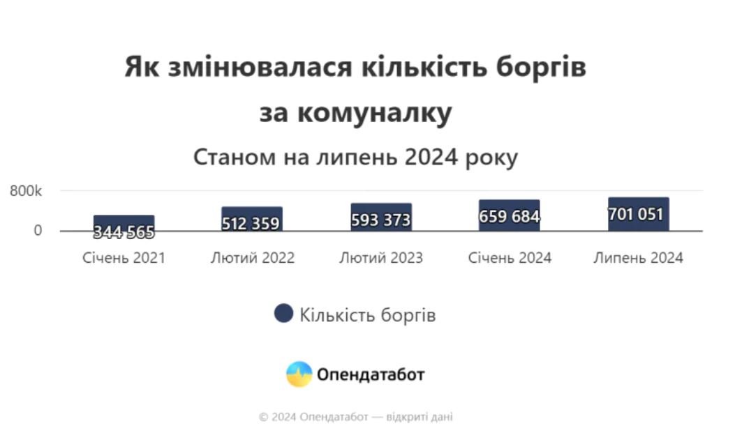 Нині в Україні налічується 701 тисяча проваджень про стягнення боргів за житлово-комунальні послуги. Від початку повномасштабної війни боргів побільшало на 37%. Станом на лютий 2022 року в реєстрі було 512 359 таких проваджень.