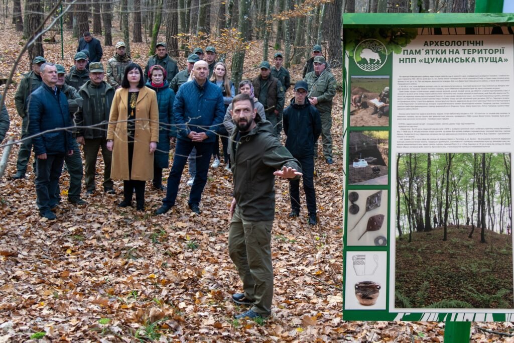 Віталій Деркач додав, що з часом маршрут матиме продовження, бо ще є чим здивувати відвідувачів. Інтригує містичним Чортовим болотом, 700-літніми дубами і тисячолітніми валами.За локацію для екостежки обрали урочище Кормин. Це ліс, луки, болота і річка, де зростають понад 800 видів рослин, в тому числі й червонокнижних, близько двох сотень різновидів грибів, водиться незліченна кількість усілякого птаства (тут гніздиться й рідкісний чорний бусол, якого ще кличуть чорним самітником) і близько сотні представників дикої фауни. Про все це природне різноманіття детально і цікаво оповідають науковці нацпарку, а їхні розповіді доповнюють інформаційні та інтерактивні стенди.Не менш захоплива екскурсія і тутешнього фахівця з еколого-просвітницької роботи. В природничу тематику тісно вплетена історія. На кількох кілометрах екологічної стежки – безліч свідчень різних періодів: курган з язичницькими похованнями ІХ-Х століть, оборонна лінія Першої світової війни, бункери Брусилівського прориву, вузькоколійка і канали князів Радзівілів, шрами Другої світової, артефакти партизанського і національно- визвольного руху.На одному з місць поховань вояків УПА працівники заповідника спорудили пам’ятний хрест. У день відкриття маршруту його освятив місцевий священник. У своїй промові отець Тарасій наголосив про важливість пам’ятати історію і берегти природу, бо вона – теж храм. Каже, церква також долучилася до цього, зобразивши на іконах червонокнижний рослинний світ Цуманської пущі.Голова Цуманської громади Анатолій Дорошук, лісничий за професією, усіляко підтримує діяльність національного парку. Стверджує: хоч у заповіднику і заборонена будь-яка господарська діяльність, але саме він відіграє визначальну роль у брендуванні громади як рекреаційно-туристичної і науково-дослідницької території.Очільник екологічної комісії обласної ради Юрій Ройко пояснив, чому створення подібних об’єктів у час війни важливе.