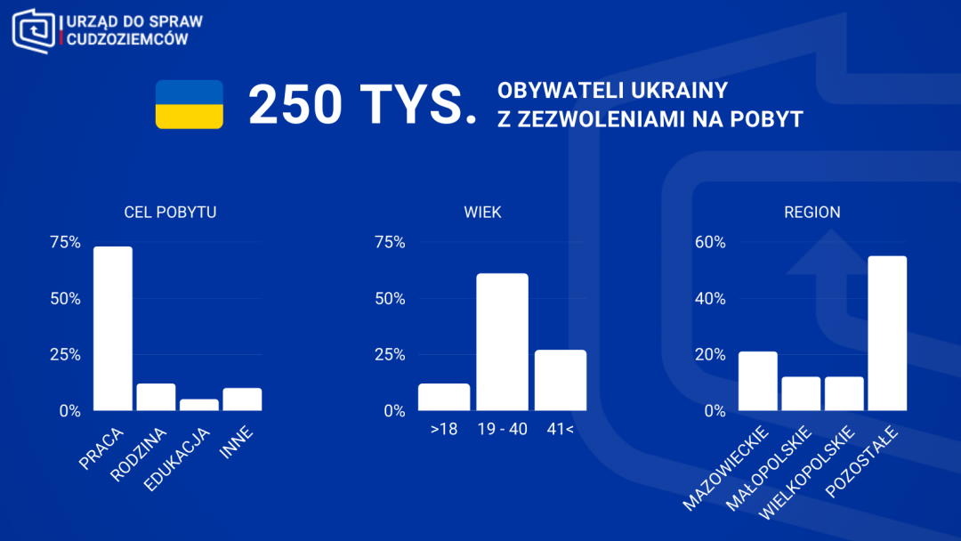Більшість осіб, які мають карти тимчасового перебування, отримали їх з огляду на роботу (73%), близько 12% - за сімейними обставинами, а близько 5% - завдяки здобуванню освіти в Польщі.Найбільше українців, які мають карти перебування в Польщі, у віковій групі 18-40 років - близько 61%, у групі понад 40 років 27%, у групі до 18 років – 12%.Як зазначається, українці, які мають посвідки на проживання в Польщі, найчастіше проживають у Мазовецькому воєводстві (адмінцентр Варшава) – 52 тисячі, Малопольському воєводстві (Краків)– 31 тисяча, Великопольському воєводстві (Познань) – 29 тисяч.