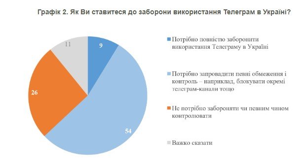 «Ми ставили запитання про ставлення до заборони Telegram загалом в Україні. Наразі лише 9% українців одразу стверджують, що його треба повністю заборонити. Водночас лише 26% вважають, що його не варто жодним чином контролювати. Натомість більшість українців (54%) вважають, що не варто повністю забороняти, а треба запровадити певні обмеження і контроль – як-от блокування окремих каналів тощо», – зазначили у КМІС.Читати ще: Буданов: Telegram – це загроза національній безпеці України