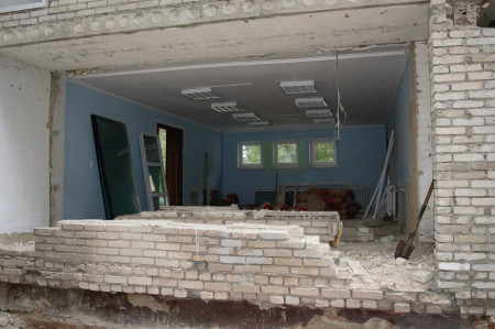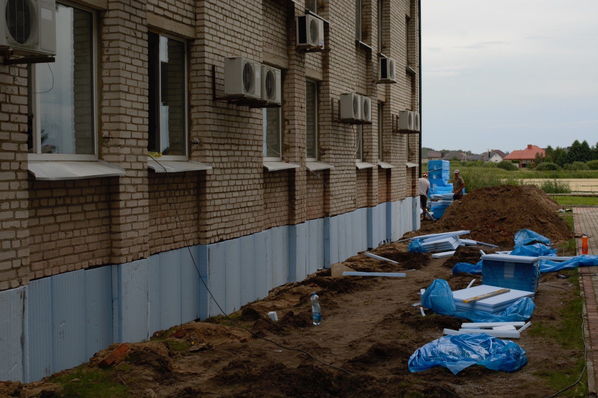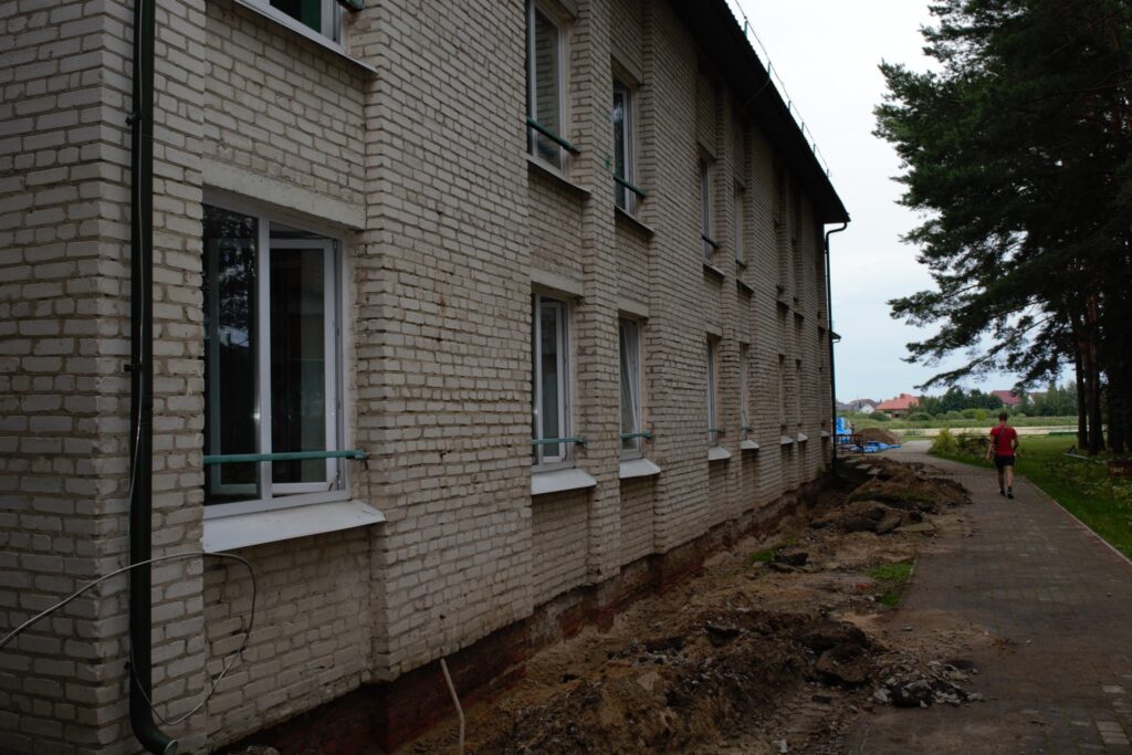 Поки у навчальному корпусі тривають вступні іспити, поруч розгорнуто масштабний будівельний майданчик. В одному з житлових корпусів взялися перекладати аварійні водо- та тепломережі. Але щойно почали, як виявили значно серйозніші проблеми: з’ясувалося, що причина грибка в приміщенні – не тільки діряві труби. Зведена у 80-х будівля була поставлена на підмурівок з червоної цегли і без жодної гідроізоляції, тож постійно всотує вологу, а пліснява дісталася ледь не горішніх поверхів. Тому знадобиться капітальний ремонт і утеплення.