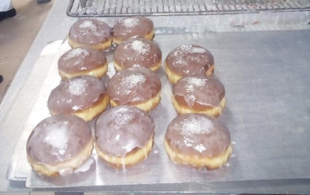 Об одинадцятій починається головна робота – смаження й декорування. Шеф і ще двоє пекарів стають біля розігрітих фритюрів, біля кожного – довгий стіл із помічниками. Пекарі вкидають пухкі кавалки тіста до олії з бульбашками, вишиковують їх рівними рядочками – загалом смажиться по 60 штук зараз. І швидко перевертають пампушки паличками, як до суші, тільки більшими. Пончики один за одним притоплюються і вискакують на поверхню, як поплавки. За кілька хвилин пекарі виймають решітки з рум’яними здобами й передають на столи. Один помічник бере гарячі пончики (працює у гумових рукавицях) й спеціальним впорскувачем начиняє їх кремом або мармулядою. Потім вкидає їх у глибоку бляху з помадкою (розріджена сиропом цукрова маса), звідки наступний виловлює їх і викладає на решітку. Потому пампухи треба оздобити кокосовою стружкою, кольоровою посипкою чи подрібненою апельсиновою шкіркою. Посипки зовсім трошки, не для смаку, а щоби розрізняти пончики за вмістом. З решітки – на металеву дошку й на стелаж, аби підсихали. Звідти їх забирають до пакувального столу. За ним стояли і власниця закладу, і її батьки та донька, і знайомі, яких вдалося залучити. Стовпи коробок підпирали стелю в цеху й коридорах. Використали майже півтори тисячі картонних ящичків.