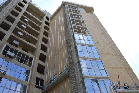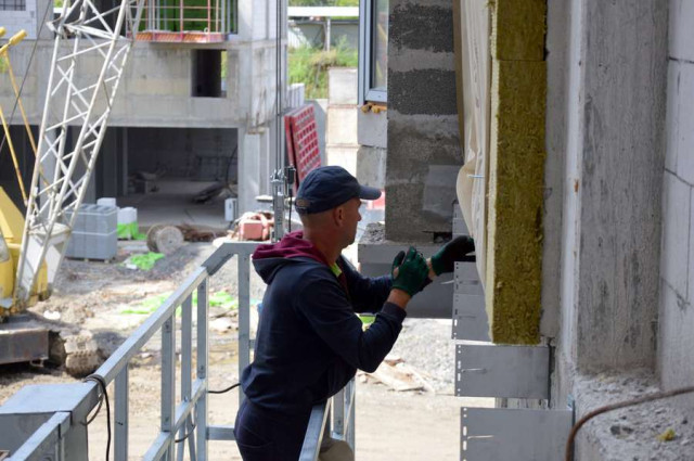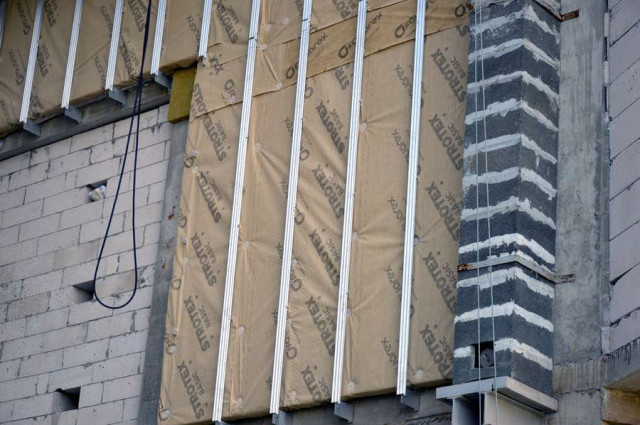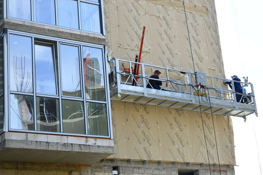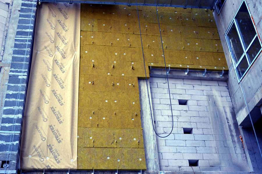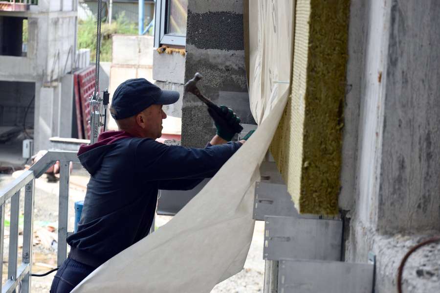Наразі в одному будинку завершено монолітні роботи, покладено апаратну штукатурку, проведено стяжку підлоги, облаштовано системи димовидалення та вентилізації.Окрім цього, фахівці вже проводять туди електричні мережі, водопостачання та каналізацію. Тим часом, поряд активно «виростає» другий будинок. До слова, від початку всього будівництва минуло лише дев’ять місяців (але упродовж трьох місяців робити не відбувалися взагалі через карантин).І поки він «росте», у першому розпочали монтаж вентильованого фасаду. Будівлю утеплюють мінеральною ватою товщиною 10 сантиментрів (та 15 сантиметрів у місцях, де ймовірність замерзання вища), яку покривають спеціальною мембраною з подвійною дією.Взимку вона не пропускає холоду та не випускає тепла з помешкання, а влітку – підтримує комфортну температуру в кімнатах.Потім на мембрану кріпитимуть керамогранітні плити розміром 120*60 сантиметрів.Директор ТзОВ «Казкова оселя» Андрій Худоба зазначає, що керамограніт – найбільш надійний та хороший матеріал для фасаду. Він не вигорає, не втрачає кольору, не боїться ані холоду, ані спеки. Термін його експлуатації складає 200 років.Зі слів забудовника, у більшості випадків житлові комплекси зводять з цегли або газоблоків. Часто, для здешевлення та пришвидшення використовують пінопласт та мокрий фасад: