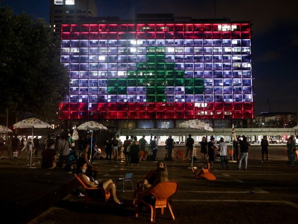Будівлю мерії Тель-Авіва в середу ввечері підсвітили в кольори прапора Лівану в знак солідарності з постраждалими від вибухів у Бейруті.