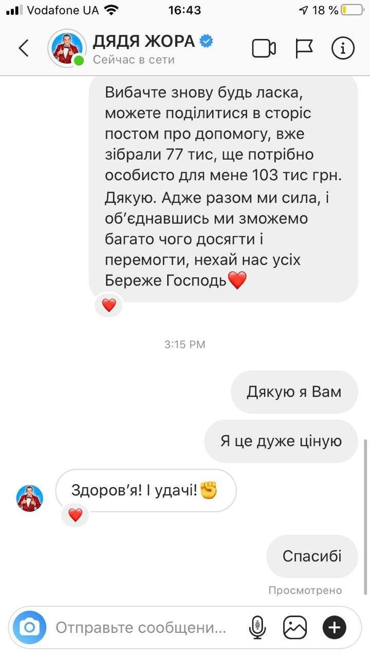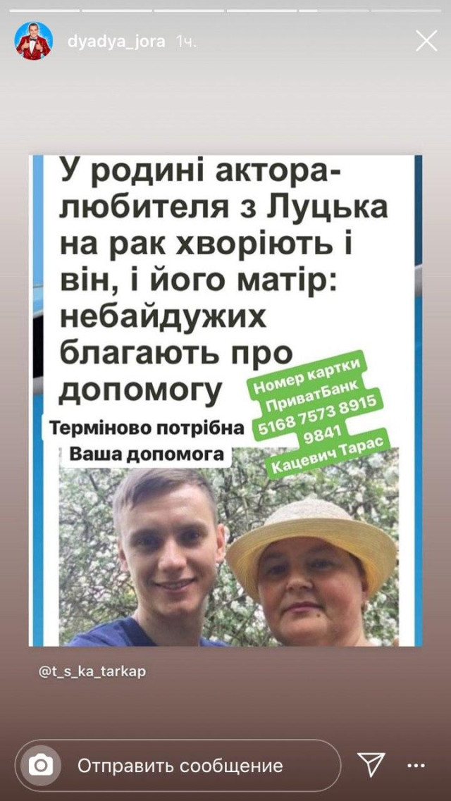 «Здебільшого селебріті ігнорували або відмовляли. Але Дядя Жора охоче розмістив інформацію про мене і маму в своїх історіях у Instagram, і особисто побажав мені здоров’я та удачі», – тішиться лучанин.Реквізити для допомоги: