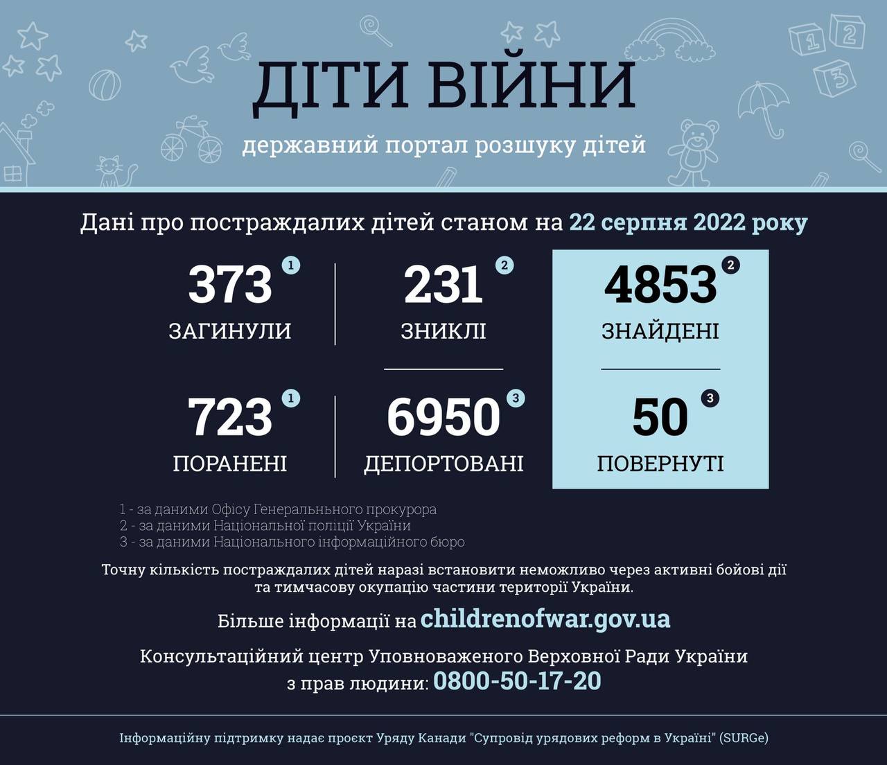 «Більше ніж 1096 дітей постраждали в Україні внаслідок повномасштабної збройної агресії російської федерації. Станом на ранок 22 серпня 2022 року офіційне число дітей-жертв за добу не змінилося – 373. Зросла кількість поранених – понад 723», – йдеться в повідомленні.