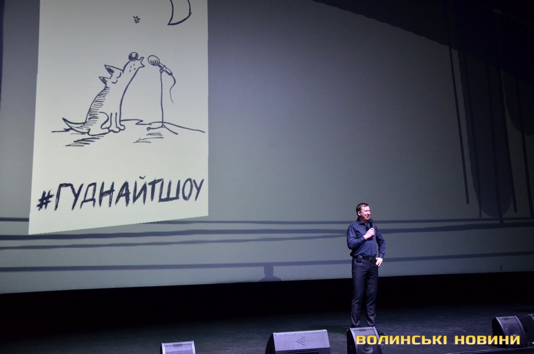«Спасибо вам за то, что пришли. Я надеюсь, что количество людей в процессе концерта будет увеличиваться, и не только благодаря темноте… Программа называется «Гуднайтшоу». В чем заключается шоу? Сначала я выхожу на сцену, а вы просто сидите в зале, да й в принципе – все. Это все активности, предусмотренные на сегодняшний вечер. Единственное – иногда можно аплодировать, а в идеале – смеяться».Розпочав гуморист із розповідей про рекламу. Він зазначив, що телевізійна реклама ґрунтується на жіночій логіці, адже 70% всіх покупок, здійснених в інтернет-магазинах чи супермаркетах, роблять саме жінки. Як приклад він навів рекламу ліків від втоми для жінок.Окрім того, рекламодавці грають на трьох основних інстинктах людини – це їжа, секс і страх: