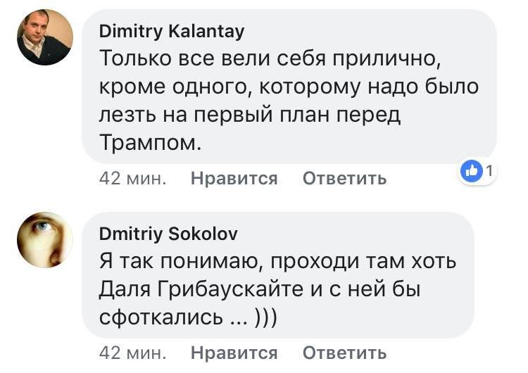 Так, колишній очільник АП Андрій Портнов на своїй сторінці у Фейсбуці опублікував подібний знімок, з того ж ракурсу, де зображений Дональд Трамп, його дружина Меланія та прем'єр-міністр Іспанії Педро Санчес з дружиною Марією.Також Трамп сфотографувався з президентом Хорватії Коліндою Грабар-Китарович.Користувачі соцмережі висміяли фото Порошенка, адже АП намагалася подати знімок, наче звіт двосторонньої зустрічі. Так, в коментарях люди завуважили, що "добре, що це хоча б не фотошоп" та що "Трамп з дружиною - неначе експонати музею воскових фігур".