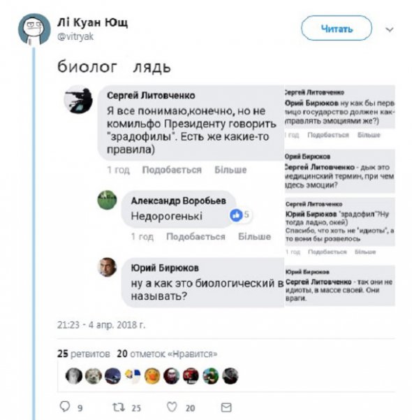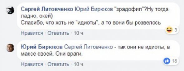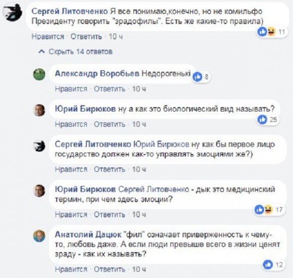 Під постом Бірюкова розігралася справжня полеміка через використаного Порошенком на адресу журналістів і блогерів епітета "зрадофіли".