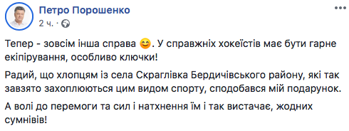 "Тепер - зовсім інша справа. У справжніх хокеїстів повинна бути хороша екіпіровка, особливо ключки! Радий, що хлопцям з села Скраглівка Бердичівського району, які так захоплюються цим видом спорту, сподобався мій подарунок. А волі до перемоги і сил і натхнення їм і так вистачає, ніяких сумнівів!" - повідомив глава держави.На фото нижче показані діти з хокейними ключками і в шоломах. Чи подарував Порошенко ковзани юним хокеїстам не повідомляється. Однак на знімках видно, що вони грають, як і раніше, в чоботях, черевиках і валянках.