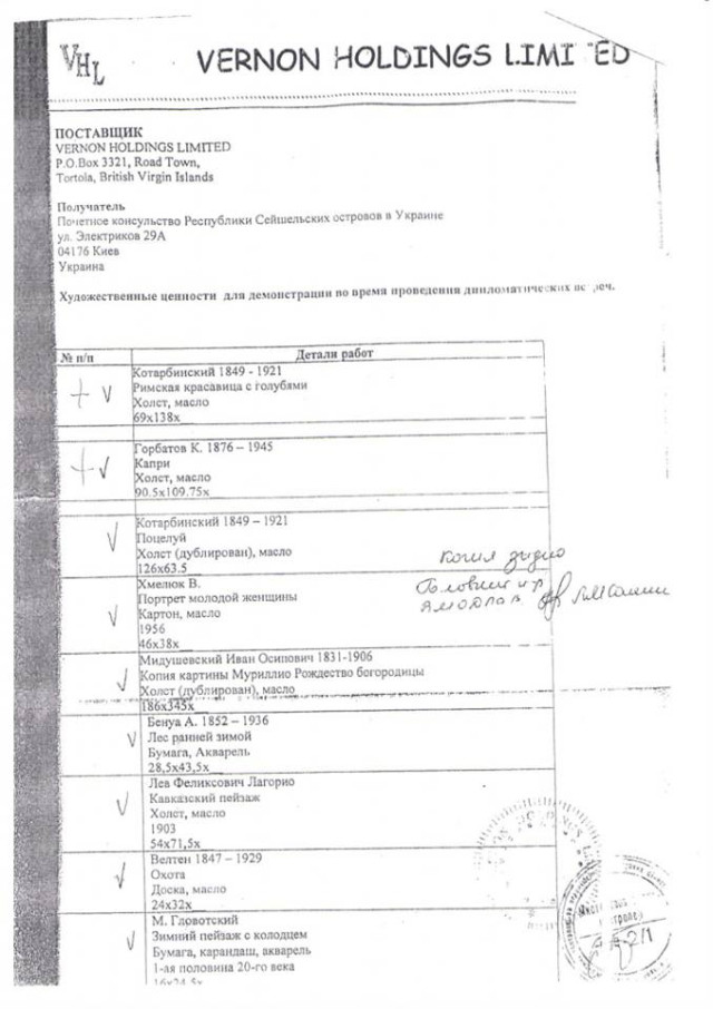 Наливайченко стверджує, що через цей офшор («Vernon holding ltd.», – ред.) Порошенко та Гладковський купляли на найбільших акціонах світу найдорожчі картини Айвазовського, Левітана та інших художників. Картини купляли за мільйони фунтів стерлінгів, а до України завозили через вищезгаданий офшор, оформлюючи на почесне консульство Сейшельських островів, щоб не сплачувати податки (нагадаємо, Почесним консулом цих островів на той час був Олег Гладковський, зараз консульство очолює його син Ігор, який, як і батько, фігурує у гучному розслідуванні щодо розкрадання в оборонному комплексі, – ред.).