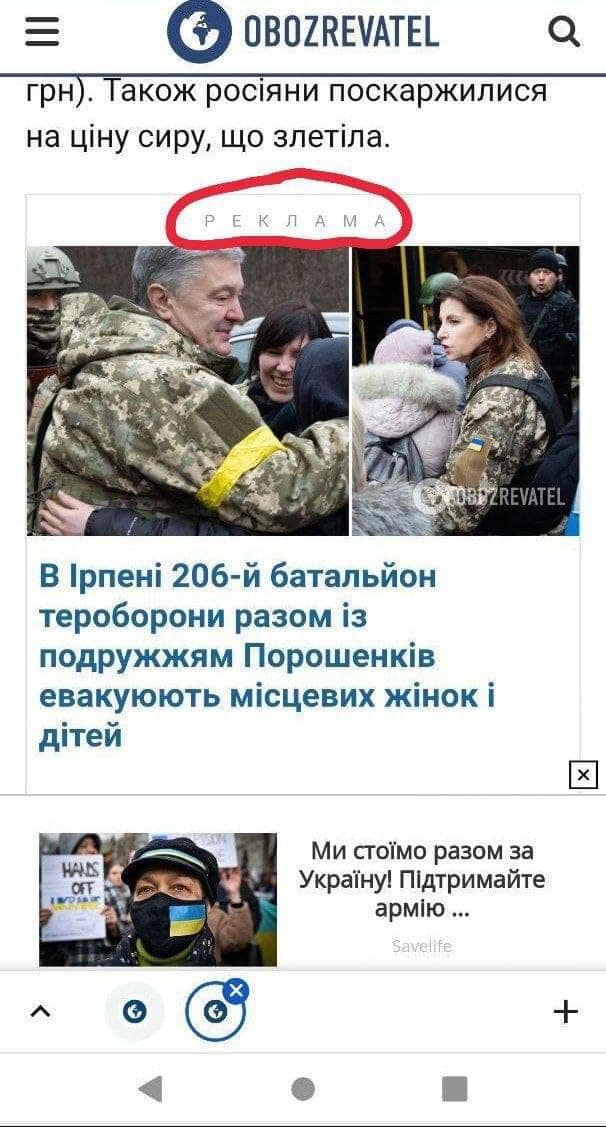 5 березня пресслужба «Європейської солідарності» замовила платне розміщення в ЗМІ низку статей про те, як подружжя Порошенків приїхали допомагати евакуйовувати людей з Ірпеня, Бучі та навколишніх сіл.Пресслужба поширила відео, на якому люди обіймаються з політиком, вітаються та дякують.