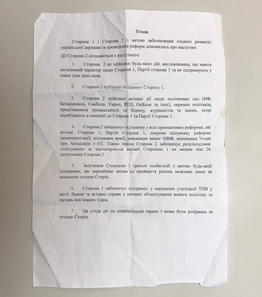У документі, опублікованому Садовим, йдеться, що «Сторона 1 і Сторона 2 з метою забезпечення сталого розвитку Української держави та проведення реформ» домовилися про те, що «Самопоміч» не критикує і публічно підтримує дії президента.