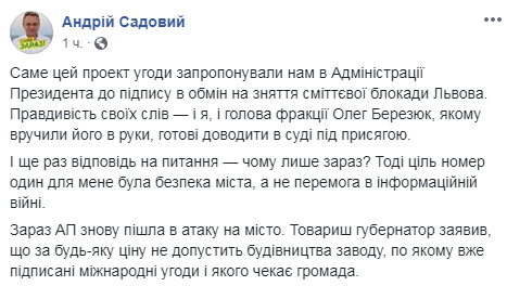Міський голова Львова, кандидат в президенти України Андрій Садовий опублікував угоду, яку йому нібито пропонували на підпис від імені президента України Петра Порошенка в обмін на вирішення питання про утилізацію сміття у Львові. Умови «угоди» він оприлюднив у Facebook.