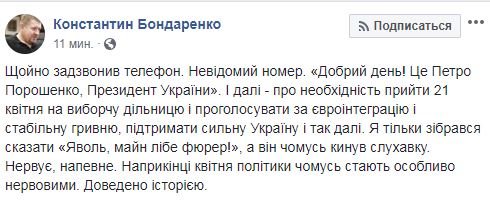 «Це Петро Порошенко, Президент України. 21 квітня – вирішальний день, що вирішить долю країни. Прошу Вас підтримати мій курс…», – агітує президент.Лучанин Сергій Поха зазначив, що до нього телефонували з київського номеру. Також зафіксовані дзвінки на телефони лучан з номеру +380892200022.За аналогічним прикладом телефонують до абонентів по всій Україні. Анатолій Гриценко розповів, що кинув слухавку, не дослухавши агітації.Політолог Костянтин Бондаренко жартує, що тільки збирався відповісти «яволь, майн лібе фюрер!», як президент кинув слухавку.Звідки в штабу Петра Порошенка база з номерами мобільних телефонів Українців – невідомо, проте зрозуміло, що в БПП намагаються всіма силами хоча б скоротити відрив від Володимира Зеленського, якого, за останнім опитуванням, підтримує 73% українців.