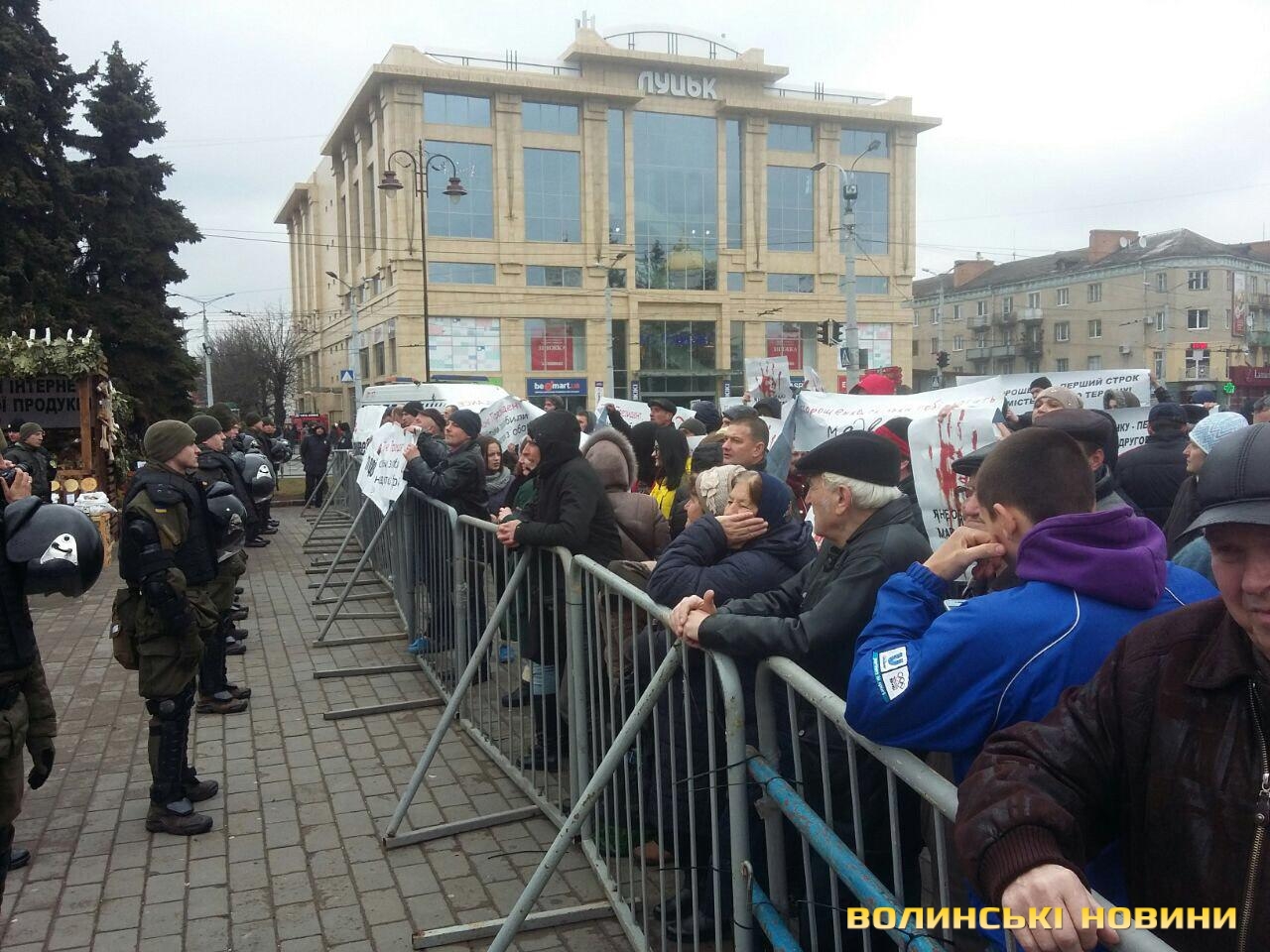 Днем раніше в Луцьку з'явився величезний банер зі словами «Ти став президентом на крові хлопців 51 ОМБР. Щоб сховати свої злочини, твої генерали її знищили. Волинь такого не пробачає» та білборди з фразою «Зустрінь весну без пороху! Дай шанс своїй країні!».