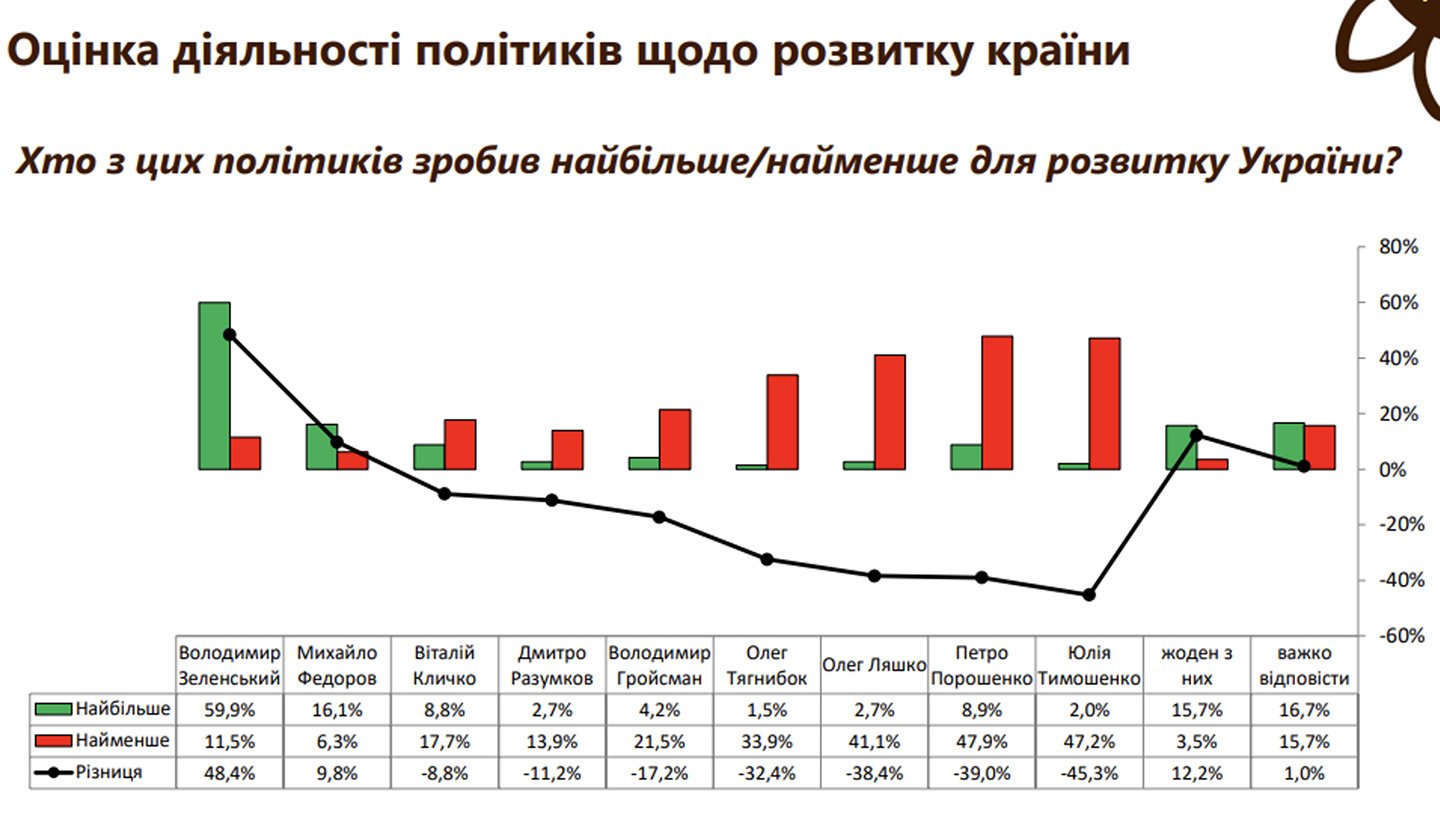 Також 70% українців назвали діяльність Петра Порошенка шкідливою та виключно шкідливою для України. Ще 41% опитаних вважає, що його моральні якості найгірше підходять для сучасної України і лише 6,5% респондентів мають протилежну думку.