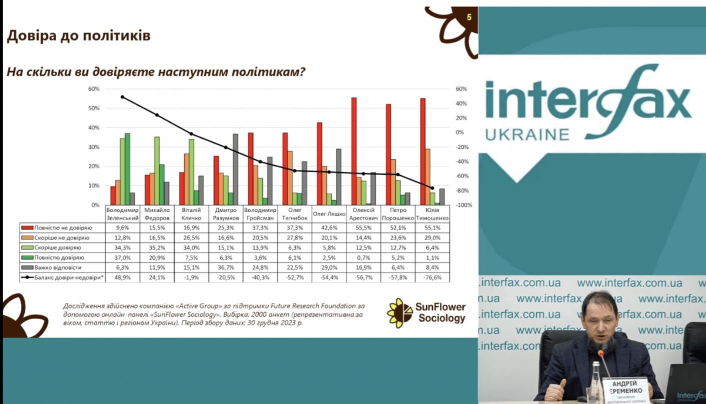 Олексію Арестовичу скоріше не довіряють 14,4% та повністю не довіряють 55,5% опитаних, Юлії Тимошенко – 29% та 55,1% відповідно.Щодо лідерів опитування, то Президент України Володимир Зеленський наразі має найвищу довіру українців серед політиків, стосовно яких запитували соціологи. Станом на кінець грудня 2023 року Володимиру Зеленському довіряють понад 71% респондентів. На другому місці – міністр цифрової трансформації Михайло Федоров. Йому скоріше довіряють 35,2% та повністю довіряють 20,9% респондентів.Також, згідно результатів опитування, українці оптимістично налаштовані щодо 2024 року для України. Кількість опитаних, які вважають, що 2024 рік буде вдалим на 17,7% перевищує кількість тих, хто має протилежну точку зору.Як повідомляли, нещодавно навколо статків Порошенка розгорівся скандал. Згідно даних НАЗК, Порошенко отримав понад 37 мільйонів гривень від уряду проросійського Віктора Орбана. Це сталось за тиждень до того, як Порошенко намагався виїхати за кордон на перемовини з Орбаном. Тоді прикордонники не випустили нардепа з країни, оскільки українські спецслужби отримали інформацію, що його візит до Угорщини може бути використаний російськими ФСБ та ГРУ.