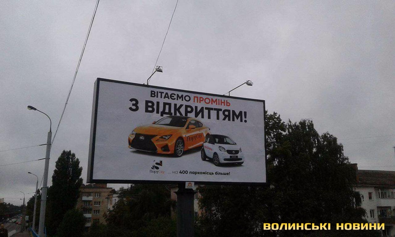 На іншому рекламному щиті торговий центр розмістив дві автівки з написом «на 400 паркомісць більше».