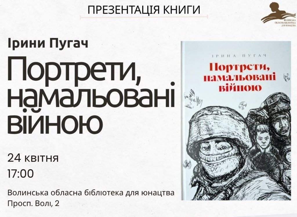 У п’ятницю, 24 квітня, о 17:00 у Волинській обласній бібліотеці для юнацтва відбудеться презентація книги військової журналістки, волинянки Ірини Пугач «Портрети, намальовані війною».