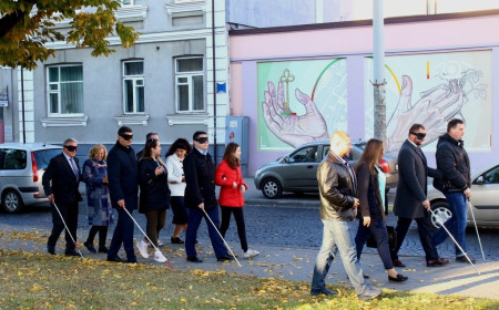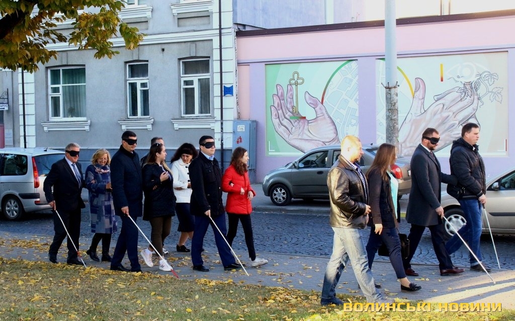 Закрити очі чорними пов’язками та провести увесь робочий день у темряві зголосилися радник міського голови Ігор Поліщук, перший заступник міського голови Григорій Недопад, заступник міського голови Костянтин Петрочук та начальник відділу транспорту та зв’язку міськради Володимир Степанов у рамках соціального експерименту, що має на меті перевірити доступність Луцька для незрячих.